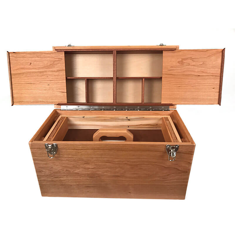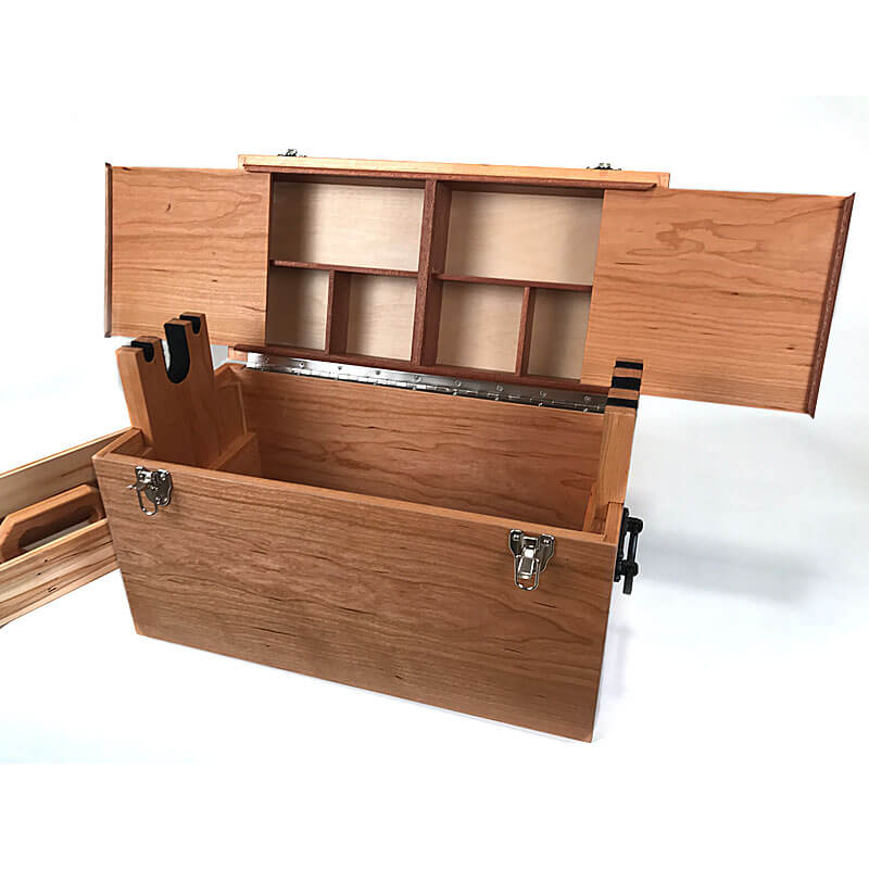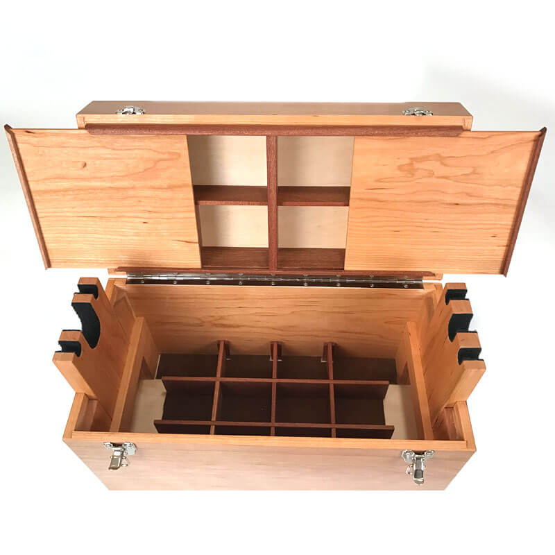 Knowing that this box is used outdoors and will take some abuse I’ve carefully applied 6 coats of clear satin Acrylic with UV protection to the exterior and hand rubbed Danish oil to the interior parts. Completing the box are nickel plated piano hinges and front latches. Black iron handles adorn the sides.