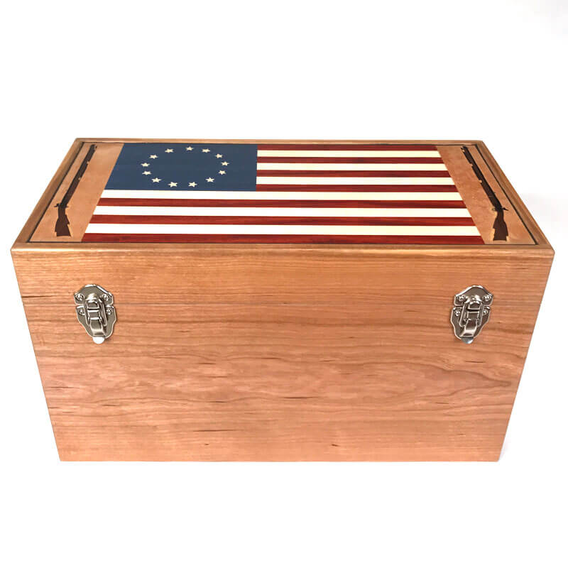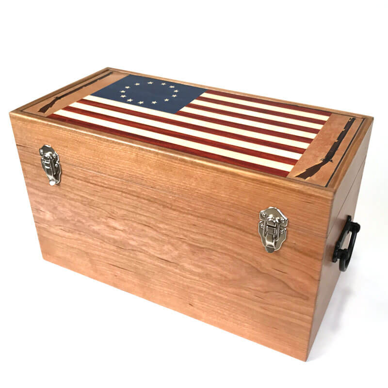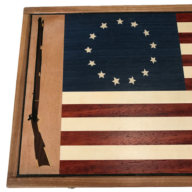 The “Betsy Ross” box features a unique lid with a representation of the traditional flag created in 1776 by Betsy Ross. It features 13 stripes of alternating woods, Paduak or Red Heart and American Holly. The 13 Stars are on a background of Blue veneer. All are handcrafted and not machined thus creating a “sewn” look from the original flag. Framing the sides of the flag are opposing Kentucky Muzzle Loaders. This form of artwork I created using a technique called “Marquetry”. The woods used here are; American walnut, Bolivian rosewood and yellow heart. The process to cut and bring together these little tiny pieces takes time but I think the end result is well worth it.