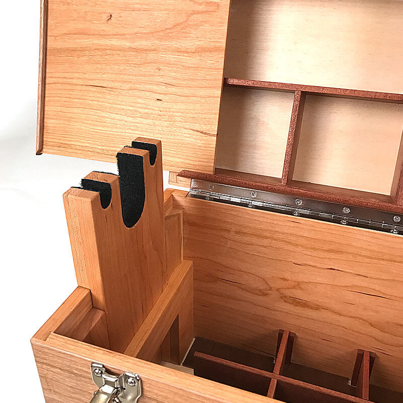 This rifle range box has form, utility and beauty all in one. Created using domestic and exotic hardwoods I’ve incorporated features that will allow you store all of your shooting supplies while you’re at the range having fun. Built into the box are accessories that will allow you to cradle your rifle, keeping it protected and at a working height that is comfortable.