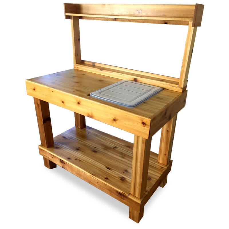 A comfortable bench height to work at for potting your plants includes an inset plastics tray with lid for a ready supply of soil. Down below is a shelf for storing bags of soil or pots and up high are handy pegs for honing your gardening tools.