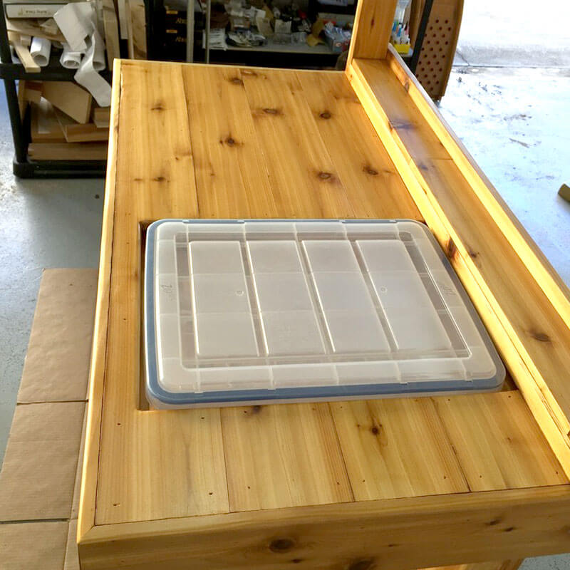 It seems a lot of my creativity is sparked by a need for others or a glimpse of form I see in nature. This potting bench was first envisioned and created from my dear mothers loving of gardening around her outdoor Lanai in Florida. Having bags of soil and tools strewn about sparked an idea in me to create this bench to allow her to pursue her love of gardening at a workable height with an easy ready to get tools and supplies.